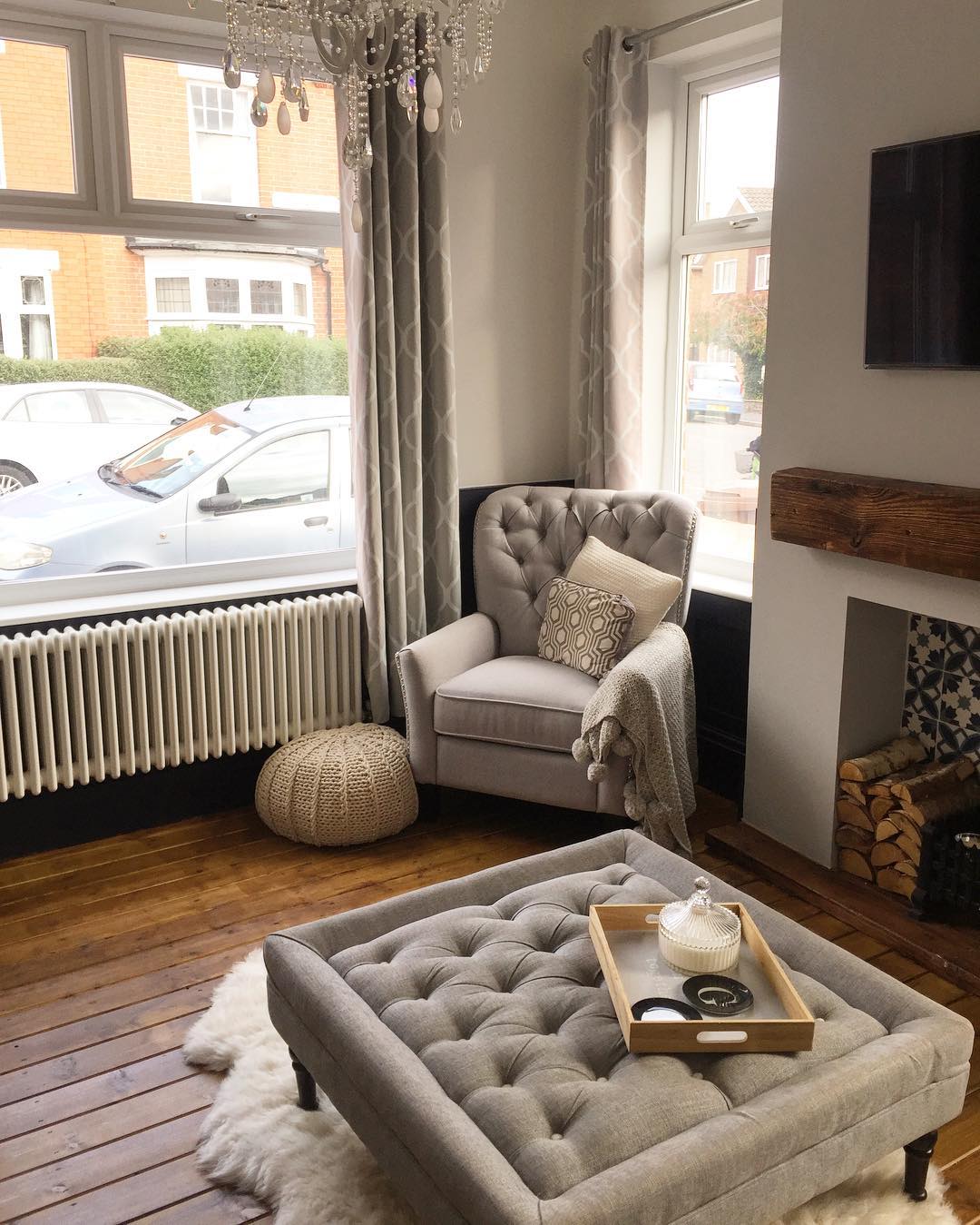 Maxwell House aka @victorianrenojourney are giving us relaxed luxury vibes with their elegant chandelier meets rustic log burner and charming chunky column radiator combo.