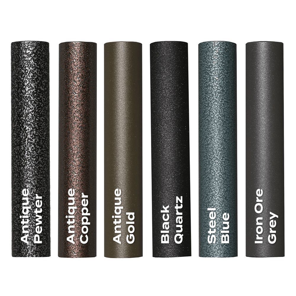 - Samples include: Antique Pewter, Antique Copper, Antique Gold, Black Quartz, Steel Blue, Iron Ore Grey