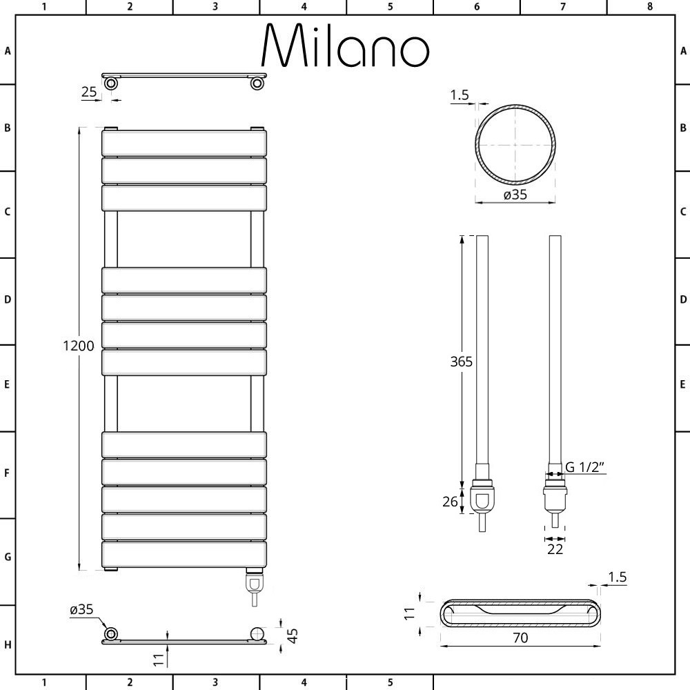 Enhance both the look and functionality of your bathroom with the Milano Lustro 1200mm x 450mm black dual fuel heated towel rail. This stylish heated towel rail works off the central heating or the electric to bring warmth to your towels in no time. It features a resilient matt black powder coated finish and sleek flat panels for a bold yet sophisticated look.