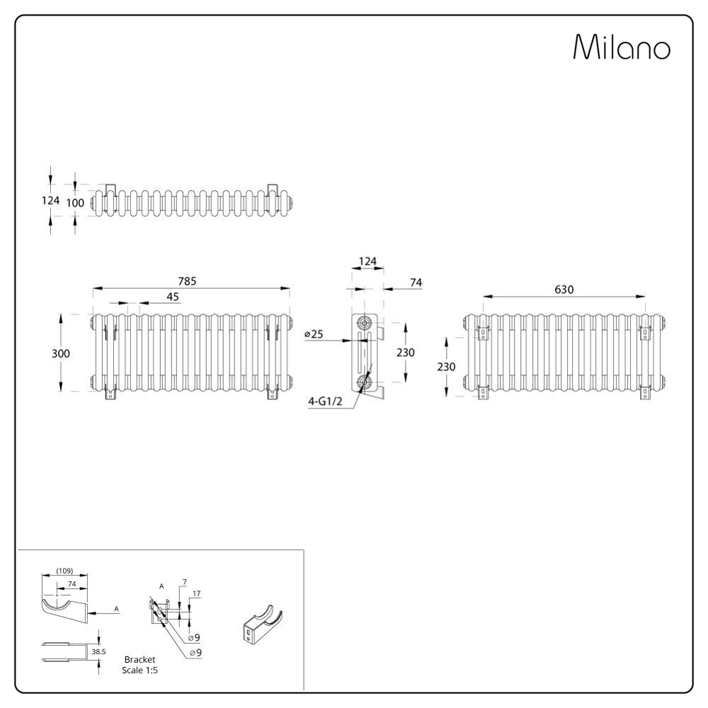 Milano Windsor - Lacquered Raw Metal Traditional Horizontal Triple Column Radiator - 300mm x 785mm